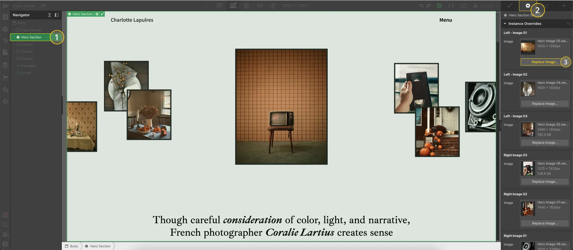 To change the Hero images Select "Hero Section - Symbol"Go to the "Gear Icon (on the right panel)" and change the images to your preferences.